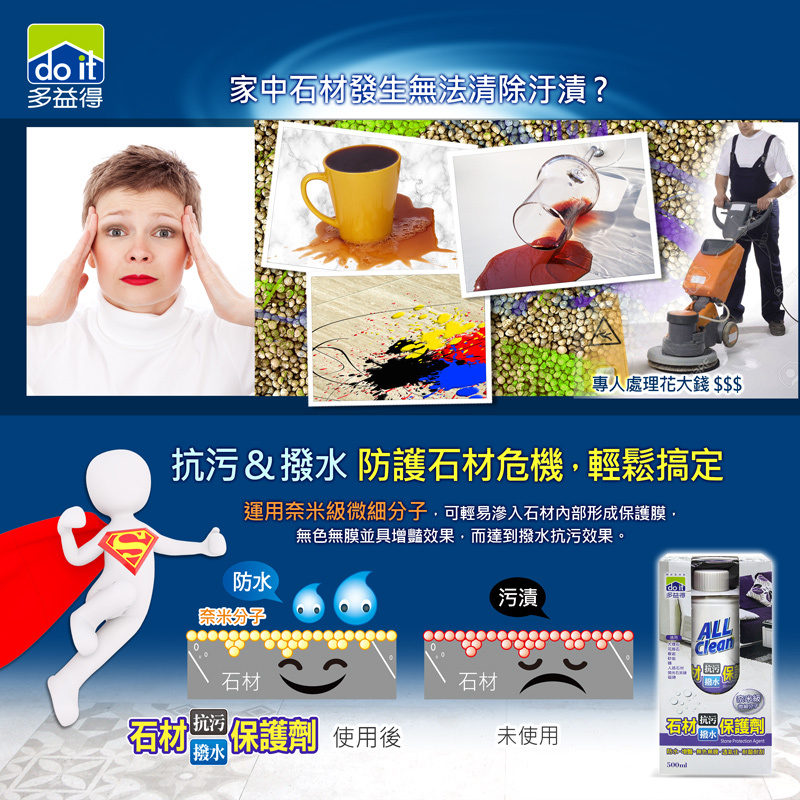 運用奈米級微細分子,可輕易滲入石材內部形成保護膜,無色無膜並具增豔效果,而達到撥水抗污效果。