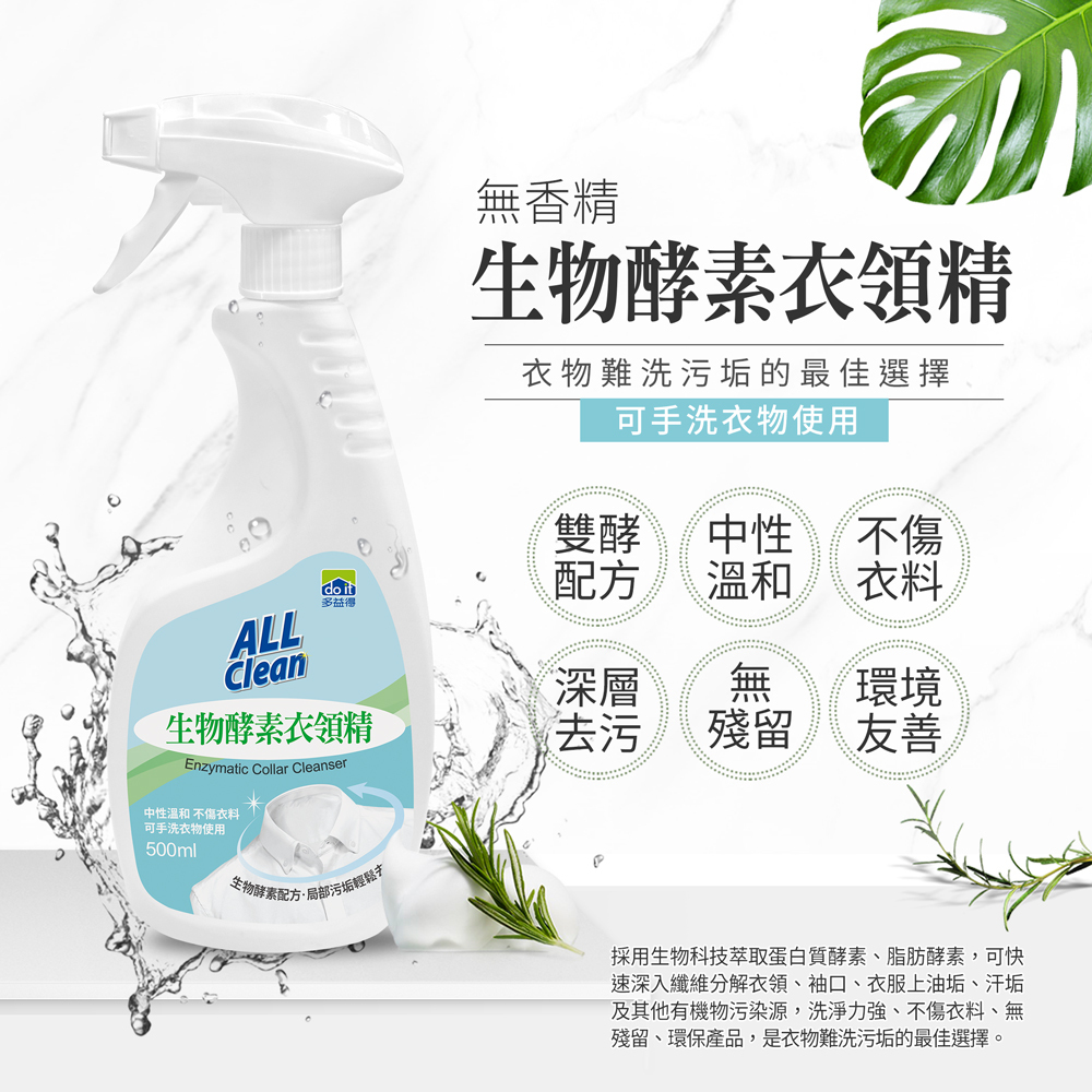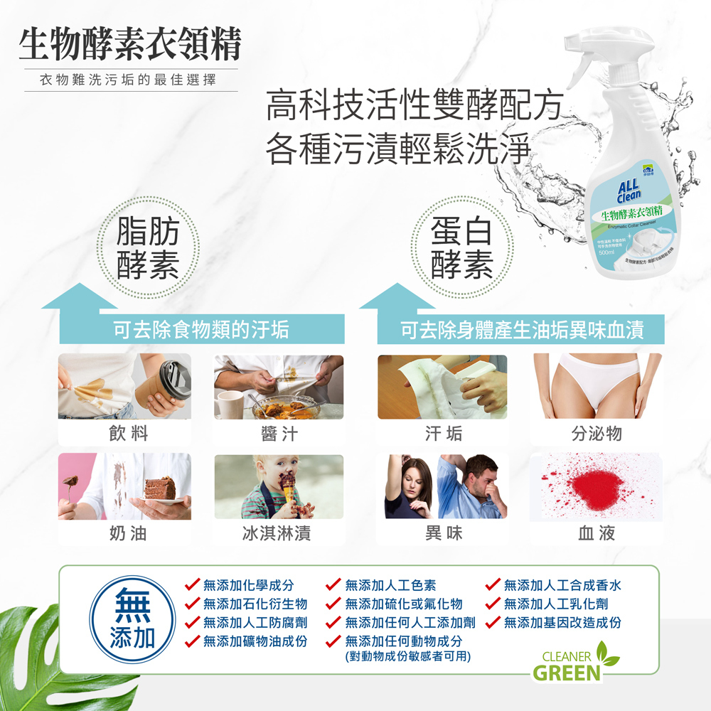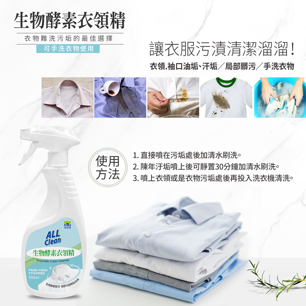 All clean生物酵素衣領精採用生物萃取天然蛋白質酵素、油脂酵素,可快速深入纖維細縫分解衣領、袖口上、衣服上油垢、污垢及其他有機物污染源,洗淨力佳、不傷衣料、無化學殘留、天然環保,是衣物難洗污垢的最佳選擇。