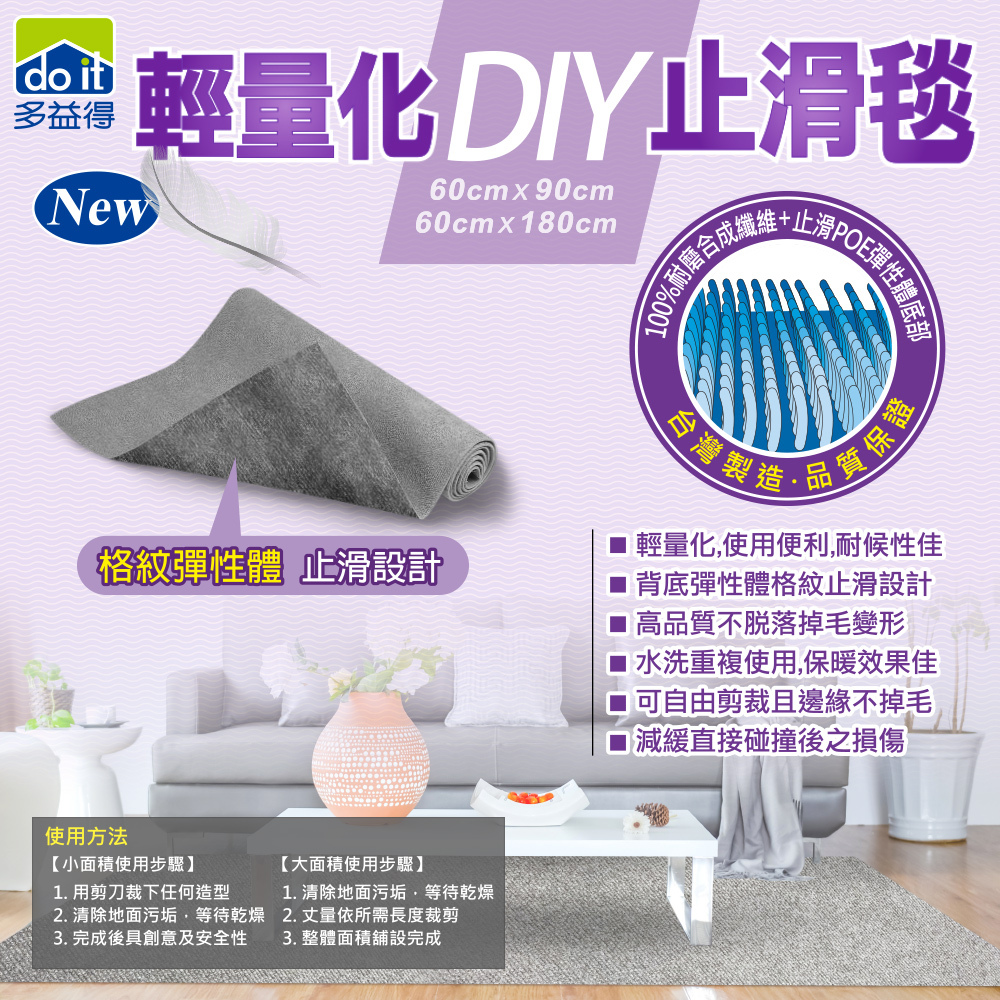 多益得輕量型止滑毯有別於第一代有背膠的舊款,它的特色是利用格紋彈性體達止滑效果,沒有背膠更便於移動清潔,可延長使用壽命。