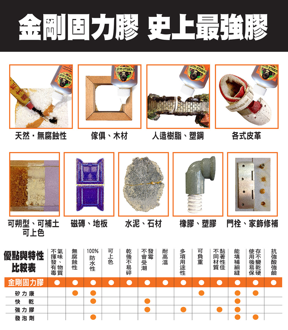 ◆廣泛用途:輕鬆黏合木材、石材、金屬、陶瓷、玻璃、混凝土等各種材質