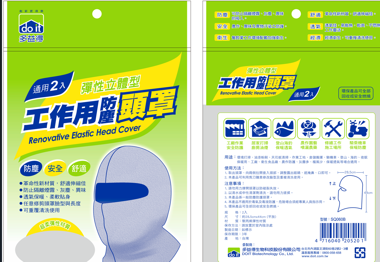 彈性立體頭罩,舒適 伸縮 透氣佳能全面性包覆 防護更緊密屬環保產品可全面回收及安全燃燒適用於:衛生食品廠、電子工廠、作業工地、倉儲搬運、居家環境打掃、油漆粉刷、登山、海釣、農作防護、擋風沙等場合。規格:型號:SQ060B容量:2入一包成份:聚炳烯彈性材質產地:台灣