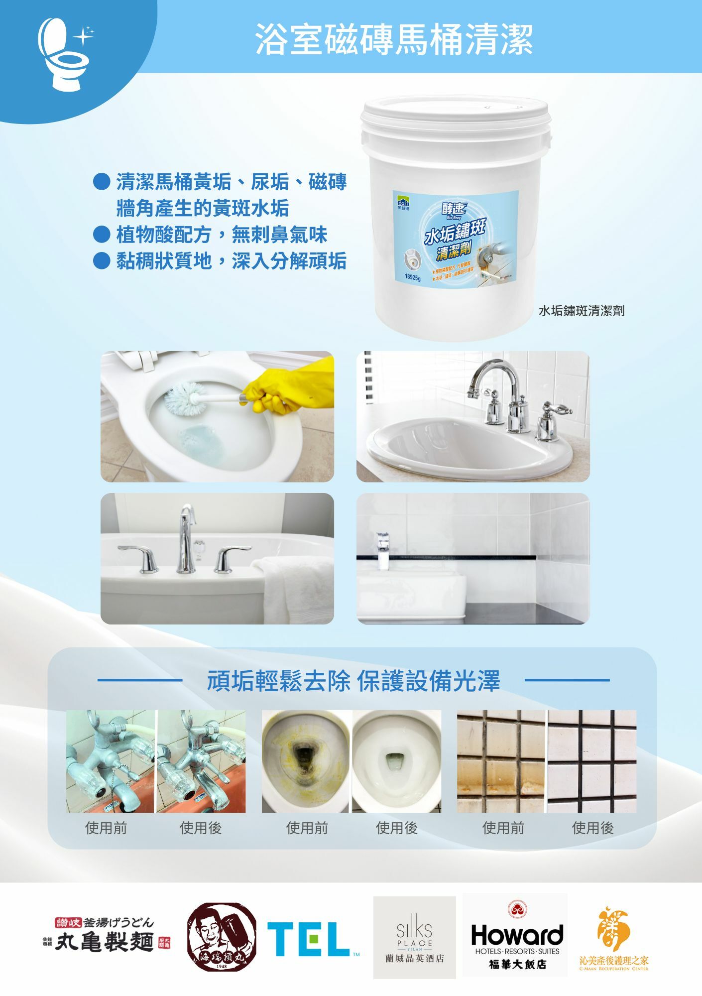1. 請勿使用於大理石、天然石材、石英磚、無釉地磚(有毛細孔不建議使用任何清潔劑) &電鍍材質