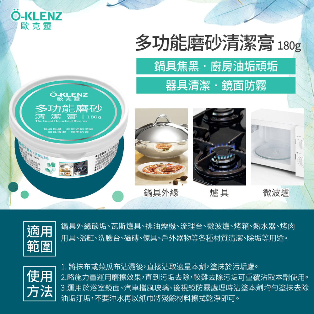 適用於:鍋具外緣炭垢、瓦斯爐具、排油煙機、流理台、微波爐、烤箱等清潔。