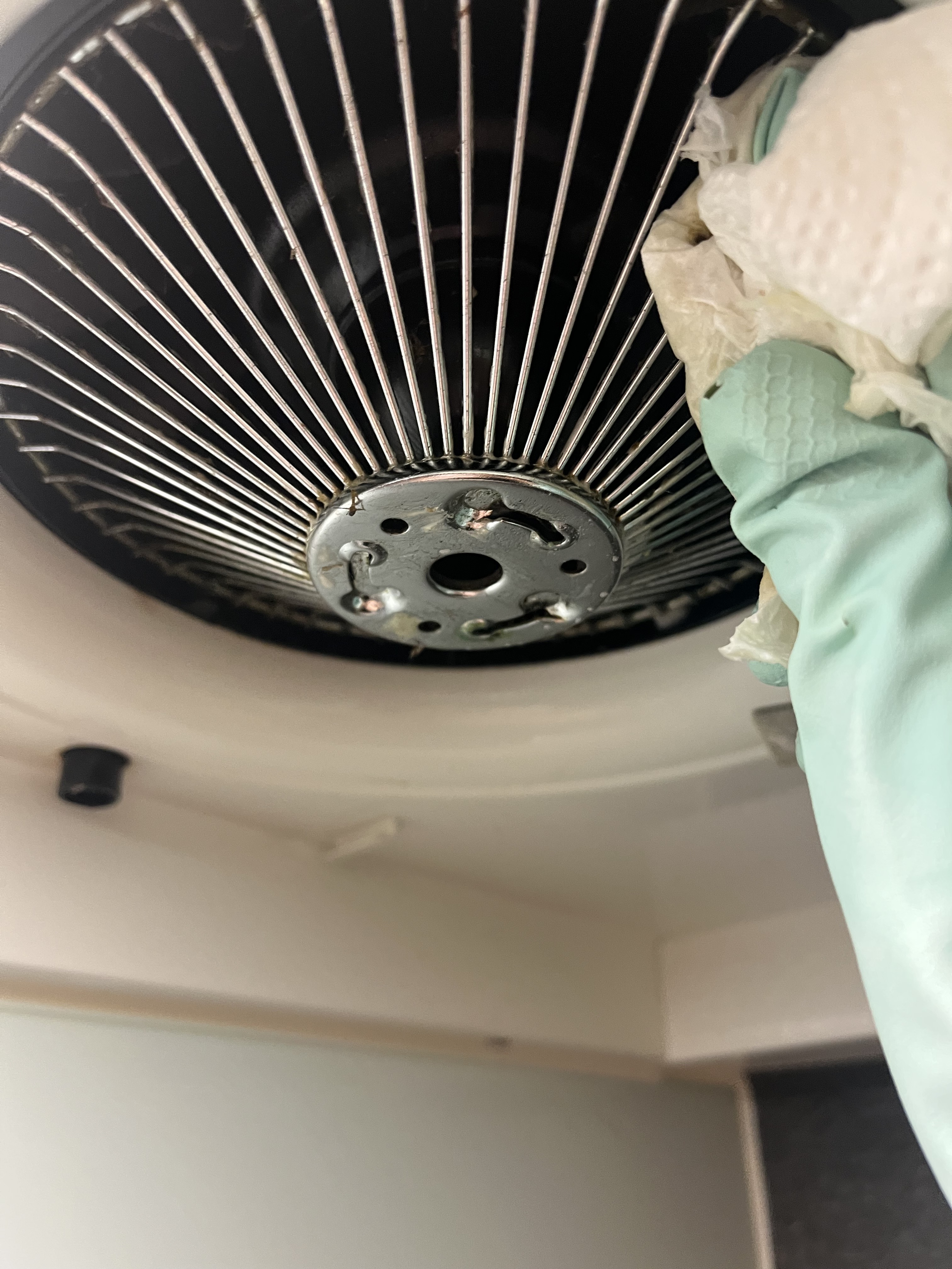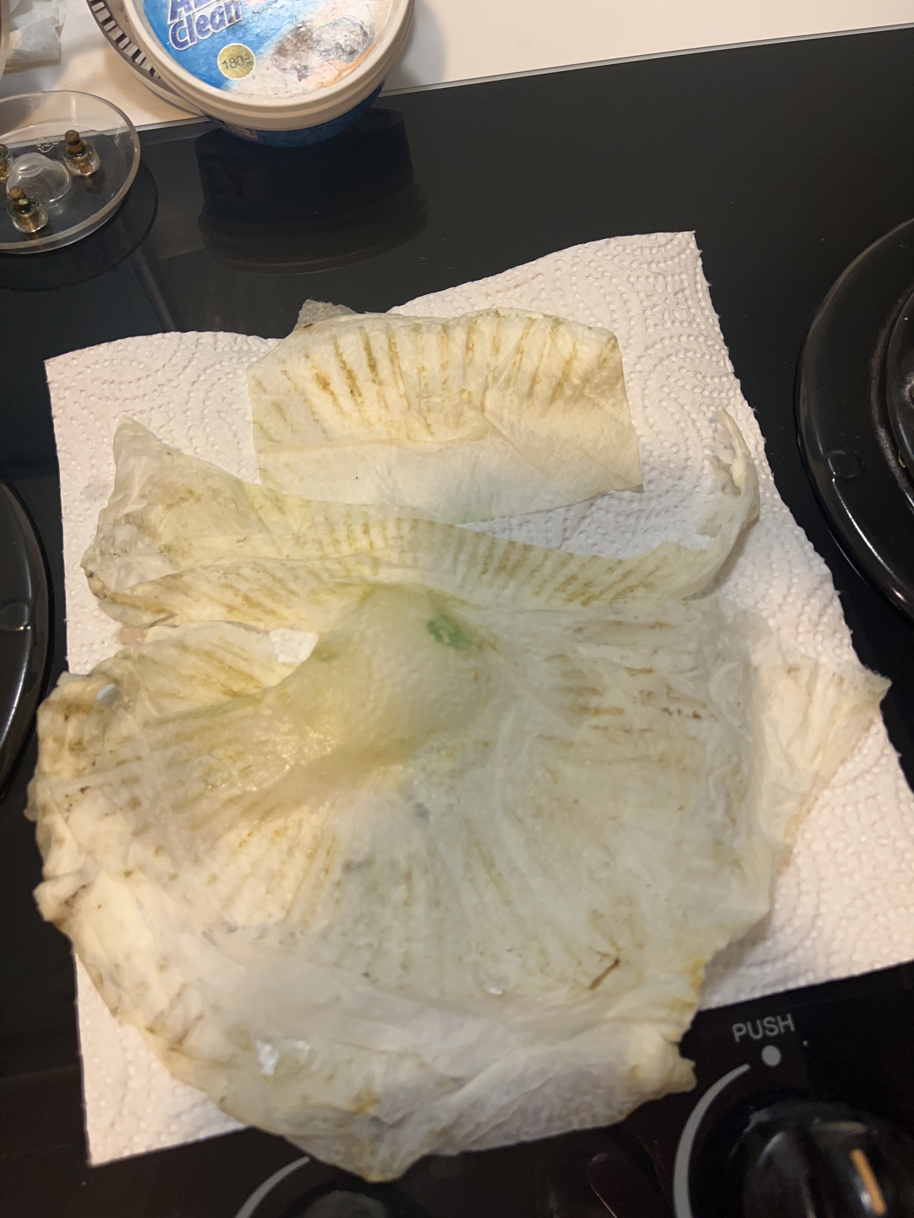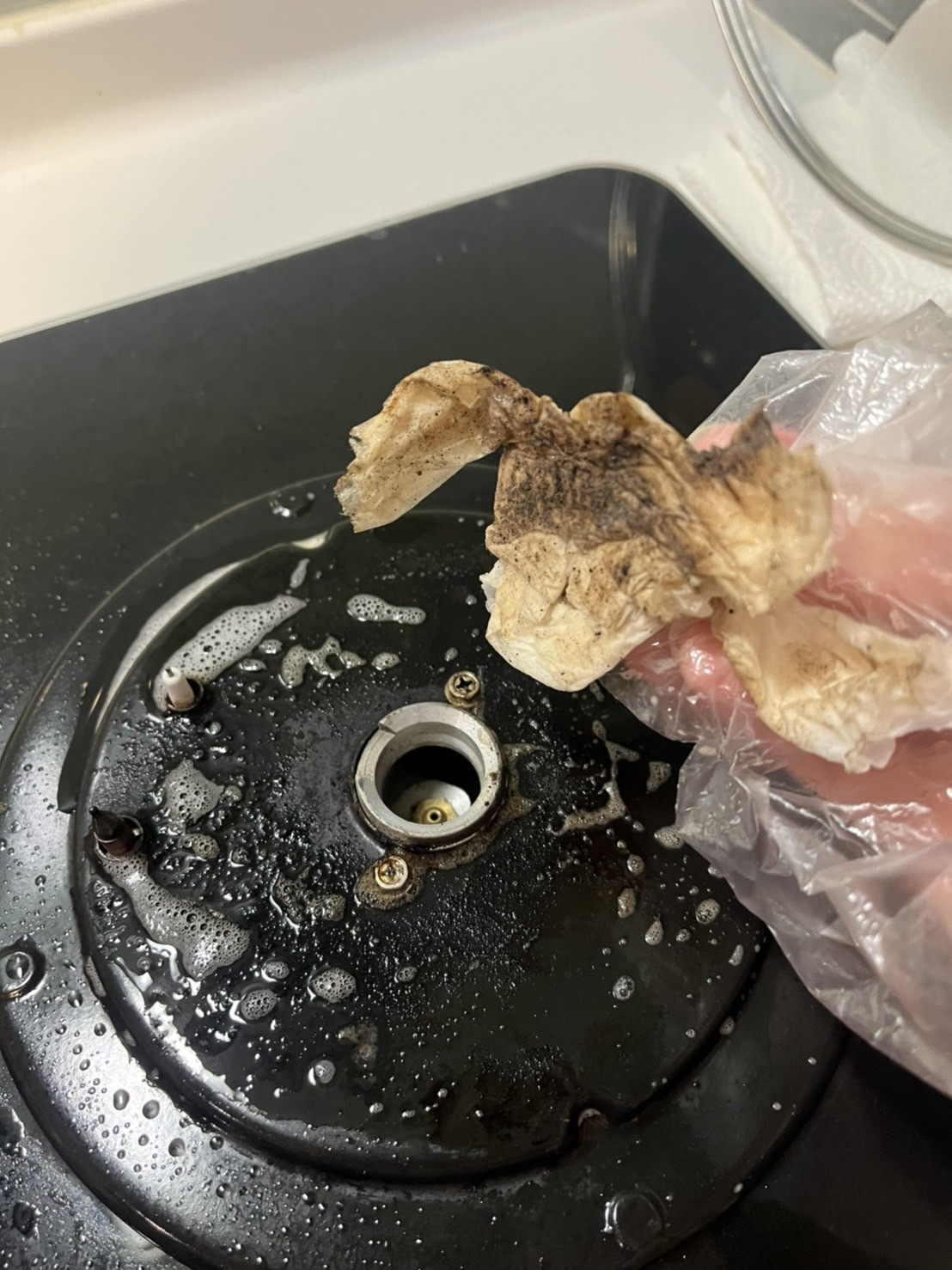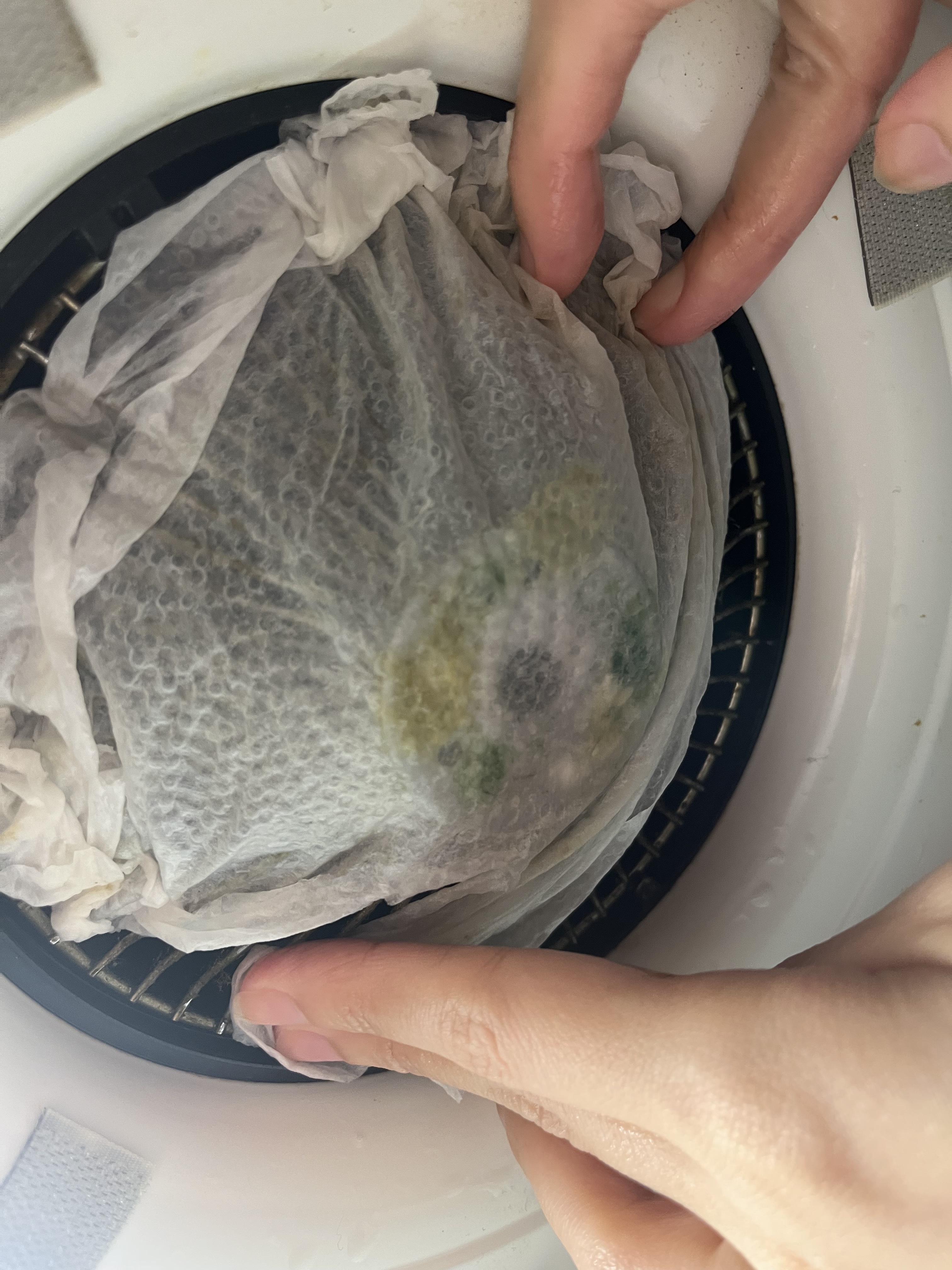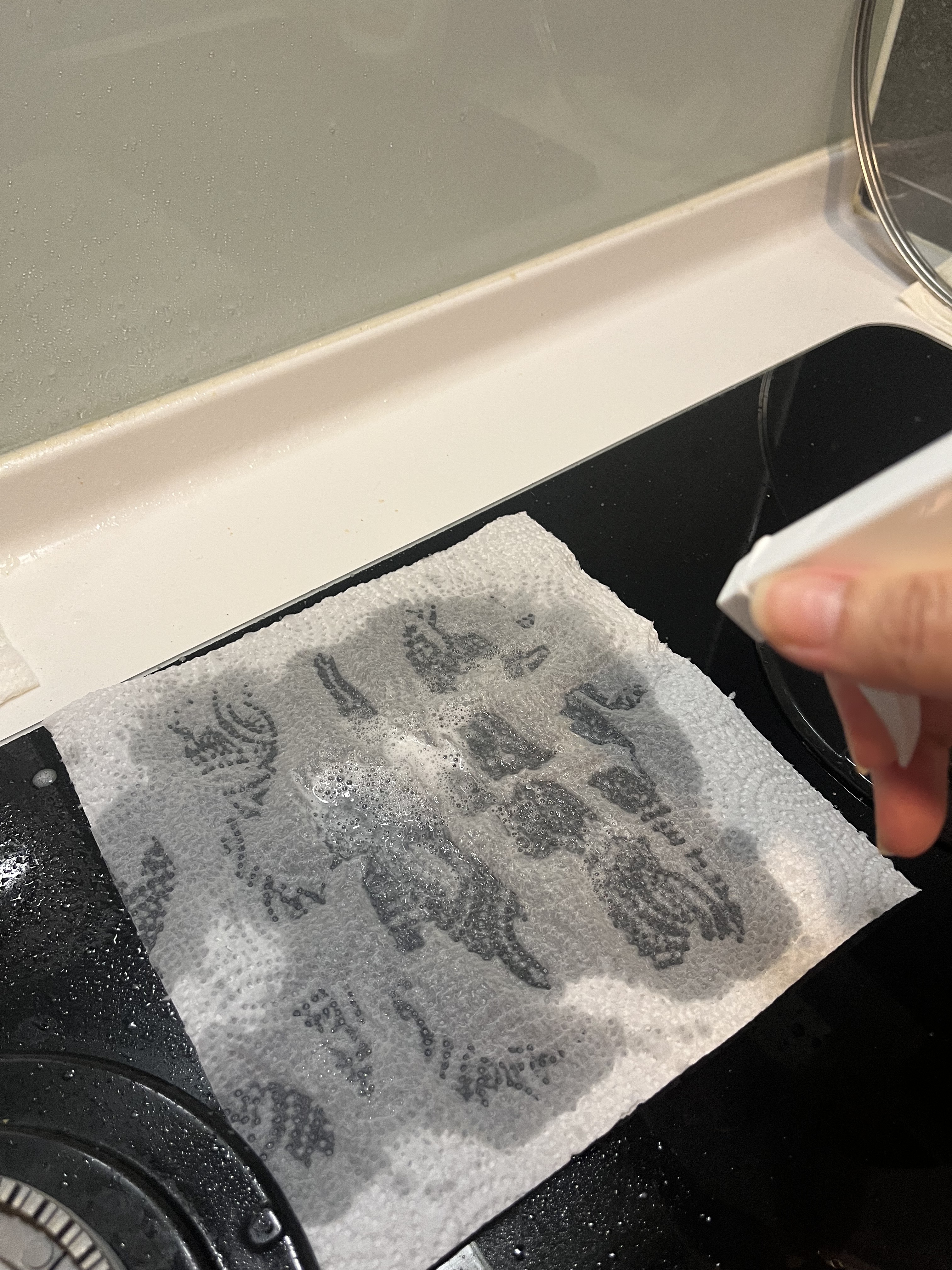 將酵素噴在紙巾上後敷上油垢處